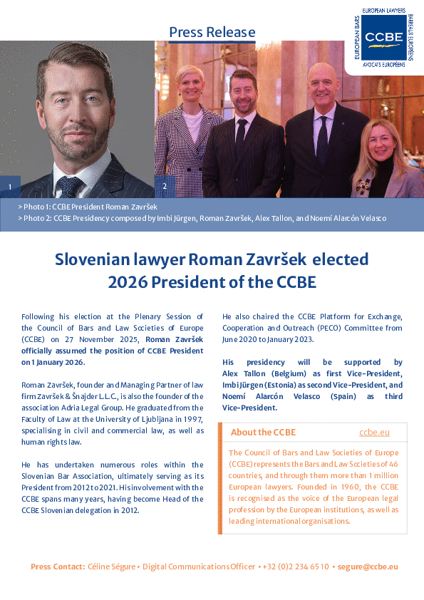 Slovenian lawyer Roman Završek elected 2026 President of the CCBE (02/01/2026)
